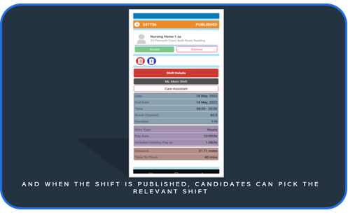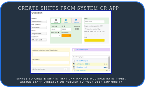 Simple to create shifts that can handle multiple rate types. Assign staff directly or publish to your user community Creating and assigning staff utilises machine learning to inform you of the latest positioning of staff and their proximity to the client’s location.