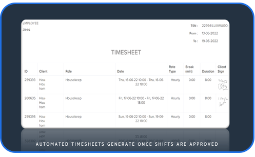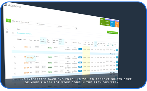 Fulling integrated back end enabling you to approve shifts once or more a week for work done in the previous week.