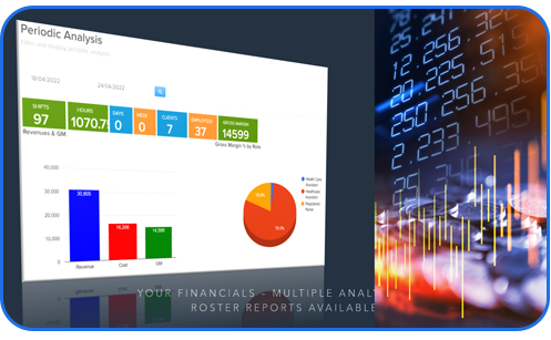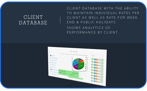 Client database with the ability to maintain individual rates per client as well as rate for week-end & public holidays. Analytics of performance by client. There is not limit to the number of clients you can add, and you can switch from active to inactive when required