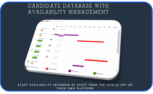 Staff availability informed by staff from the mobile app or their own platform Create and manage your candidates or manager their availability, have them fill the default application form before you make them active, book them and send them to work.