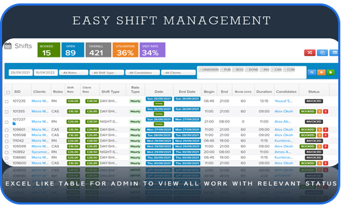 Excel like table for admin to view all work with relevant status We offer a very flexible and intelligent shift management system with configuration at many levels, and with the possibility to apply controlled changes throughout the entire process
